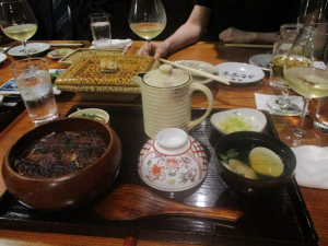 学会初日が終了し、「炭焼 うな富士 本店」でひつまむしをいただきました。うな丼の器の向こうに薬味や漬物の皿がありました。話に夢中になっていて、この薬味は2杯目にうな丼にかけて食べることになっているということに気づいていませんでした。