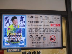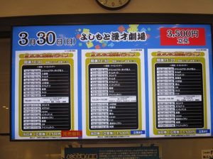 なんばグランド花月の側に「よしもと漫才劇場」と「ワッハ上方」がありました。よしもと漫才劇場は若手が公演する場のようです。ワッハ上方は正式名が大阪府立上方演芸資料館で吉本興業とは関係ないようです。「吉本新喜劇ファミリーナイト劇場」というのは建物の名ではなく、公演名のようです。「よしもとアカデミー」は「NSC吉本総合芸能学院」「よしもとクリエイティブアカデミー」などの教育施設です。YES-fmは吉本興業所属タレントが連日出演するコミュニティーFM局です。