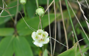霧ヶ峰高原で咲いていました。長い茎(花茎)の先端に小さな白い花が1輪だけ咲くため、全体を撮影することが難しい花です。