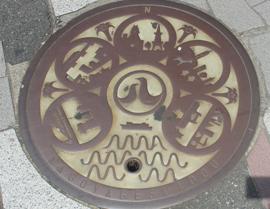 名古屋市制100周年を記念して1989年に名古屋市で開催された世界デザイン博覧会の際に設置されたマンホールの蓋です。中央に向き合った2羽のハトが描かれた市章、その周囲を名古屋港、宮の渡し、名古屋城とテレビ塔、東山動植物園、名古屋国際会議場の風景が取り囲んでいます。