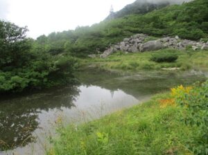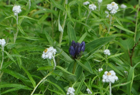 辺り一面に高山植物が咲いていて、ミソガワソウ、オヤマリンドウ、ムカゴトラノオ、ミヤマゼンコ、ハクサンボウフウ、サクライウズ、エゾシオガマ、ヤマハハコ、クロトウヒレン、イワツメクサなどを見かけました。
