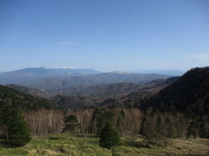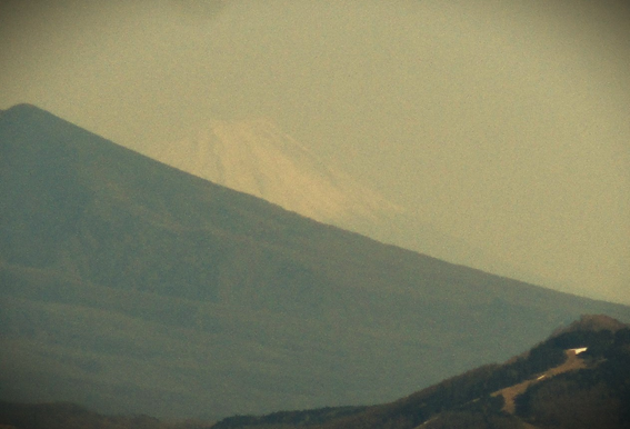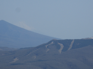 左端に蓼科山、その右肩に八ヶ岳連峰、右に南アルプスが見えますが、霧ヶ峰の富士見台よりも距離が離れたため、富士山はわかりにくくなりました。八ヶ岳の右端の三ツ頭に富士山が重なって見えていました。手前にある三ツ頭よりも奥にある富士山の方が大きく見えるので、遠近感が狂い、気持ち悪く感じます。