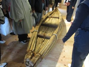 国立科学博物館主催の台湾から与那国島までの渡航を目指す「3万年前の航海 徹底再現プロジェクト」で最初に試みたのはヒメガマを縛って作った草束舟による航海でした。草束舟は荒波でも安定性がありますが、黒潮の本流を乗り切ることができずに失敗しました。大阪・関西万博のバーレーン館でも草束舟が展示されていました。