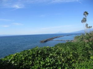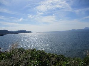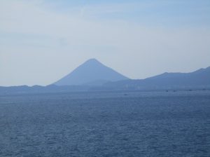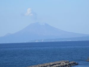 錦江湾を見渡すと右手に噴煙を上げる桜島、左手に開聞岳(薩摩富士)が見えました。これから桜島まで北上し、フェリーで鹿児島市に渡りました。