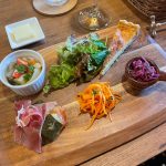 家の近所にスペインバルがオープンしました。前菜プレートに酢漬け、キッシュ、生ハムが彩られえていました。生ハムはとろけてしまう美味しさでした。