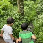 稚魚やオタマジャクシが石の下にたくさんいました。足の生えたオタマジャクシは、子供にとって不思議な生物なので、捕獲に挑戦していました。