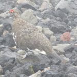 雪渓上部の斜面にライチョウの夫婦と子どもたち、併せて10羽ほどが草の実?をついばんでいました。雄のライチョウの足には識別用の赤と青の輪が取り付けられていました。