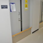 改装された区画の研究室のドアの下部に見慣れない板が張り付けてありました。大学の研究者に尋ねてみると、動物実験をおこなう研究室に設置が義務付けられている、ネズミ返しだそうです。これがあると台車に荷物を載せて部屋を出入りする…