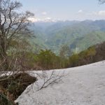 大野盆地からはどちらを見ても雪が残る山が並んでいます。特に目立つのが南側の荒島岳で、日本100名山に入っています。夜明け前に降った雨のせいか、雪解け水のせいか、直登が多い勝原コースは泥だらけの登りにくい坂が続きました。