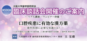 大阪大学歯学部記念会館で大阪歯科大学の王宝禮教授の臨床談話会が開催されました。「口腔疾患に有効な漢方薬」というテーマでしたが、冒頭では緒方洪庵の適塾から大阪大学歯学部につながる歴史や日本漢方の歴史を解説されました。