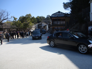 フェリーを降りて厳島神社の参道に入ろうとしたところで、警備員に「道を開けてください」と言われました。黒塗りで中が見えない車両が何台も通り過ぎていきました。この日はセルジョ・マッタレッラ・イタリア大統領がお詣りに来たということで、残念ながら神社には入れませんでした。