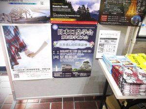 直前に印刷したばかりの「日本口臭学会第15回学術大会」のポスターを持参したので大会事務局の方にポスターを掲示したいと相談したところ、快諾を得ました。しかし、張るスペースが見当たりません。事務局の型に手伝ってもらい、手前の机を移動させて何とか張ることができました。
