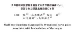 臼田聡, 高森康次, 福田諒, 中川種昭, & 角田和之. (2024). 舌の線維束性攣縮を随伴する舌下神経麻痺により診断された頭蓋底脊索腫の 1 例. 日本口腔外科学会雑誌, 70(10), 419-424.