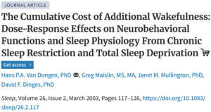 徹夜、4時間睡眠、6時間睡眠で客観的なパフォーマンスがどの程度低下するかを調べた研究が紹介されました。2日間徹夜が続くとワインを1本飲んだ状態と同程度に客観的なパフォーマンスが低下します。6時間未満の睡眠が連日続いている人は、この2日間徹夜と同じ程度のパフォーマンスしか示せませんでした。4時間未満の睡眠が続いている人では、3日間続けて徹夜したのと同程度にパフォーマンスが低下していました。
