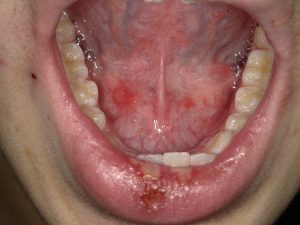 単純ヘルペスウイルスの感染により口唇や口腔粘膜、咽頭粘膜に強い痛みを伴うアフタ性の粘膜炎を起こします。発熱やリンパ節腫脹、嚥下障害も合併するケースが多く、重篤な状態となります。
