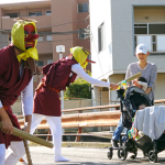 私が住む箕面市にも来訪神がいました。神様の化身である天狗や獅子舞が10月中旬の週末に八幡太神社に現れます。天狗は町中に出て子どもたちを追いかけ回します。手に持った簓(じゃり)は竹の先を細かく割ったもので、これで叩かれると…