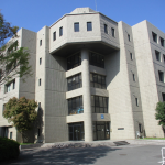 大阪大学工学部の建物はコンクリート打ちっぱなしの外観が多いのですが、最近建てられた機械系D棟はタイル張りの外壁です。この建物は歯学部に一番近く、グラウドヤテニスコートの裏手にあります。