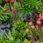 ツツジ科ツガザクラ属エゾノツガザクラ 薄いピンクの花が下向きに付いています。花びらにはうっすらと毛が生えています。花が落ちて赤い実がついているものもありました。葉がツガの葉に似ていて、花はサクラに似ていることから、栂桜の…
