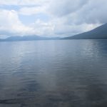 支笏湖の南に聳える標高1320mの恵庭岳の頂部は雲がかかって見えませんでした。この山は活火山のため、噴気孔が点在しています。恵庭岳の右手には門別岳があり、遠目にも電波塔が林立している様子がうかがえます。この写真は支笏湖の…