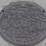 北安曇郡白馬村のマンホールの蓋には村の花「カタクリ」が描かれています。奥に聳えるのは白馬三山(鑓ヶ岳・杓子岳・白馬岳)です。白馬村の西端には北から白馬岳、杓子岳、鑓ケ岳、天狗の頭、不帰1峰、不帰2峰北嶺、不帰2峰南峯、唐…