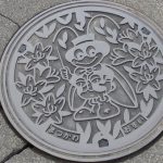 下伊那郡松川町のマンホールの蓋には、村の特別シンボルである「すずむしりん太くん」が描かれています。両脇に咲いているのは村の花「レンゲツツジ」です。松川村の西端には清水岳(2603m)、有明山(2268m)がそびえています…
