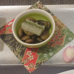 青大豆の表面に黒っぽい模様が入った鞍掛豆の醤油煮の上に子持ち昆布があしらわれていました。表面の模様が胴体の両側に蔵を掛けたように見えることから鞍掛豆の名が付きました。