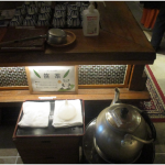 美ヶ原山頂の王ヶ頭ホテルのロビーでいつでも飲める笹茶がストーブかコンロで温められています。笹茶はクマザザを抽出したハーブティーで麦茶とブレンドされています。カフェインレスなので、夜遅くでも飲めます。