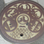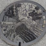 名古屋市制100周年を記念して1989年に名古屋市で開催された世界デザイン博覧会の際に設置されたマンホールの蓋です。中央に向き合った2羽のハトが描かれた市章、その周囲を名古屋港、宮の渡し、名古屋城とテレビ塔、東山動植物園…