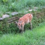 阿寒川の川岸で草を食んでいるエゾジカに出会いました。5mほどまで近づけました。