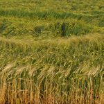 黄金色に輝く小麦畑で茎が倒れて全体に凹んでいる部分を見かけることがあります。これは「倒伏」という現象で、強風によって倒されてしまうようです。土地が肥えていて麦補が高く生長した部分が倒れやすいようです。