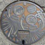 消火栓のマンホール蓋なので、火消しの組のしるしであるまとい(纏)が2本描かれています。