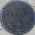 堺港に建つ旧堺灯台は1877年に建設された日本最古の木造洋式灯台です。高さは11.3mあり、1968年まで稼働していました。その燈台が描かれたマンホールの蓋で、カモメが群れを成して飛んでいます。