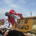 巨大な草鞋の上に人が乗っていました。お祭りの日に福島市に行かないと見られない行列ですが、わざわざ大阪にまで来ていただいたので、ありがたく見学しました。
